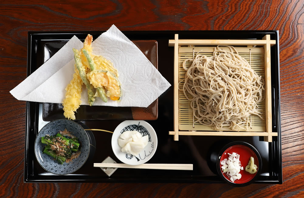 手打ち十割蕎麦 (冷たい)天ぷら盛り合わせセット1,620円手打ち十割蕎麦 (大盛) 320円(増し) - 里庵特製(数量限定)